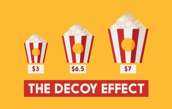 In a second step, a cup of "MEDIUM" size popcorn is added to the sale at $6.5. From this point on, the "LARGE" size will be the most successful. The reason for this is that with such a small price difference (only 0.5$) between the "LARGE" and "MEDIUM" sizes, the "LARGE" size was immediately perceived as extremely advantageous by the consumers. They feel they are getting a good deal, so they buy.