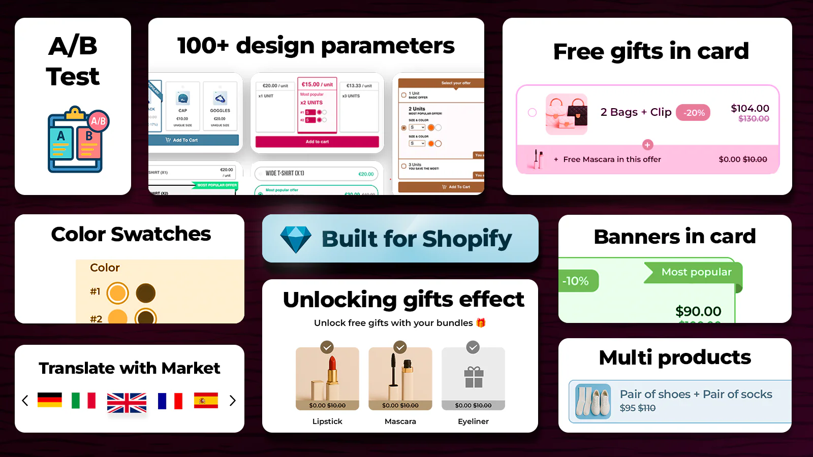 WideBundle is built to create volume discounts, mix & match bundles, quantity breaks, BOGO offers, gifts, and more—directly on your product page, with advanced customization and testing.
